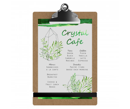 The MDF Small Menu Clipboard provides a trendy way to display menus and promote listed items. Constructed out of sturdy medium-density fiberboard (MDF), these menu clipboards secure your menu with a combination of a chic butterfly clip and a menu band. This practical design allows you to change your menu at a moments notice while still maintaining a professional and stylish look. You can even get this clipboard engraved with your company name or logo to give you a unique one-of-a-kind product. Please contact us for more information about customization.